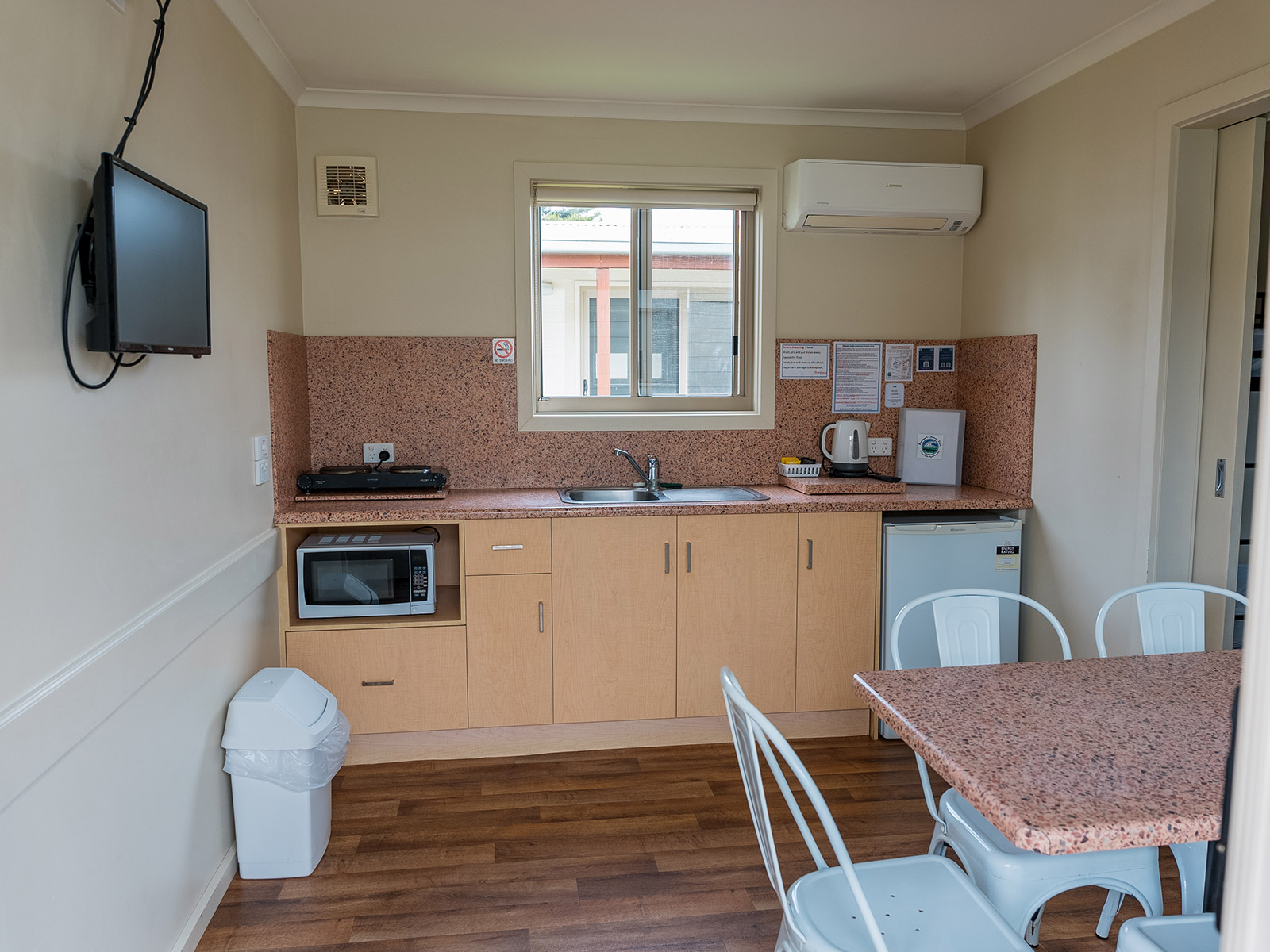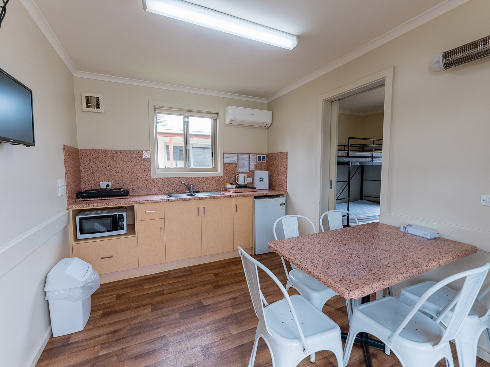 Enjoy a comfortable and affordable coastal escape in our Standard Cabin, perfect for families or small groups of up to 6 people. Each cabin includes a double bed and bunk beds, plus a well-equipped kitchenette for easy holiday living.
